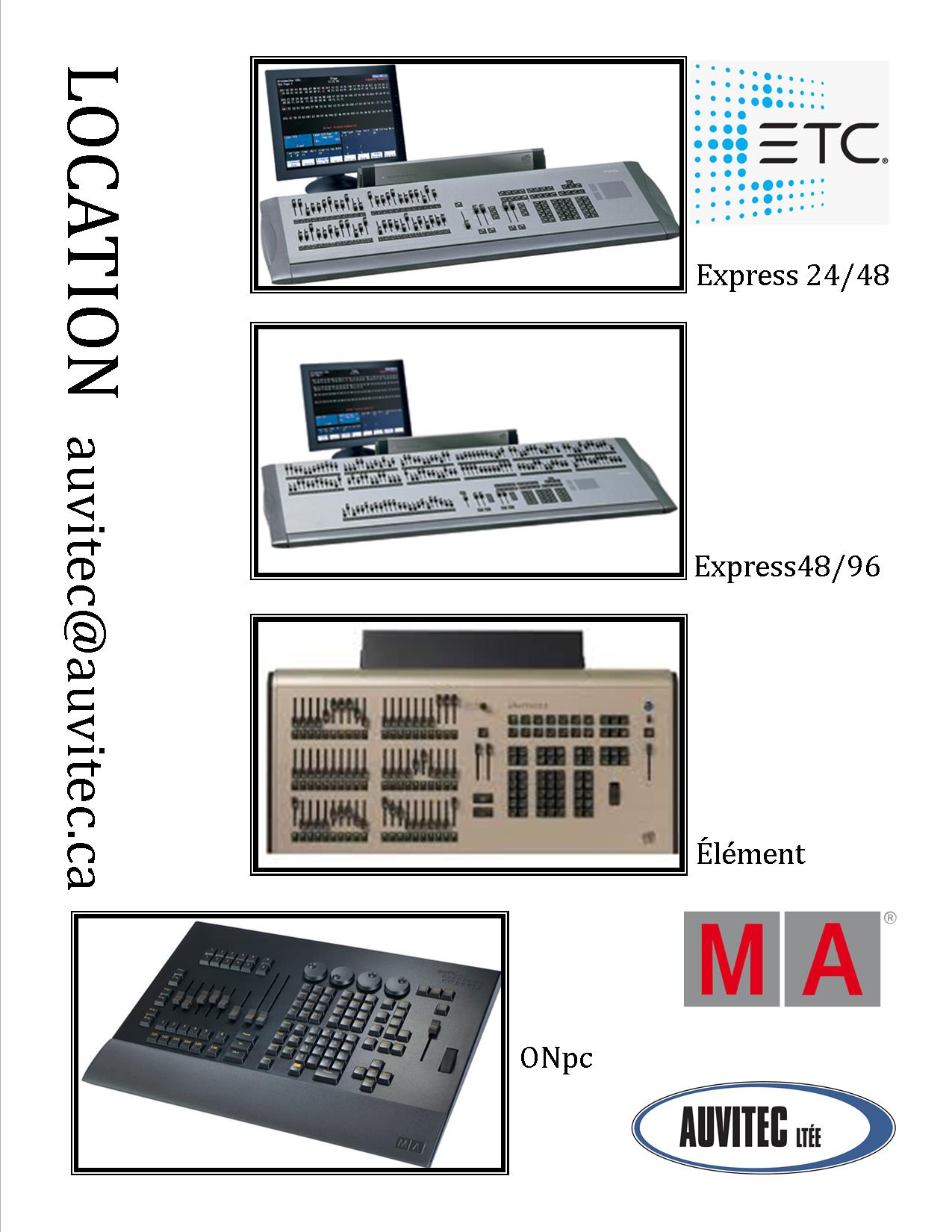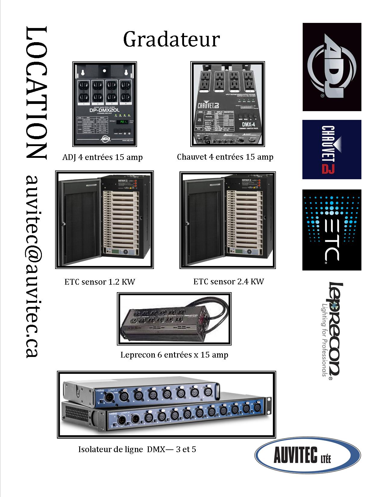 En inventaire les consoles, les gradatateurs, les fixtures traditionnel au motorisé, les structures pour supporter les installations